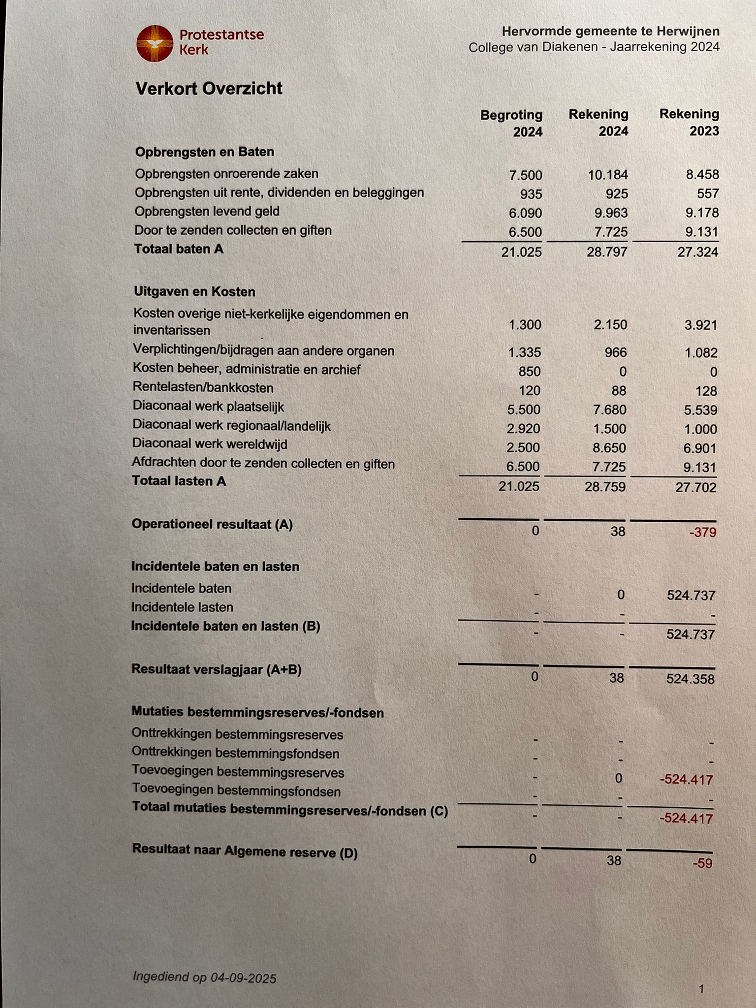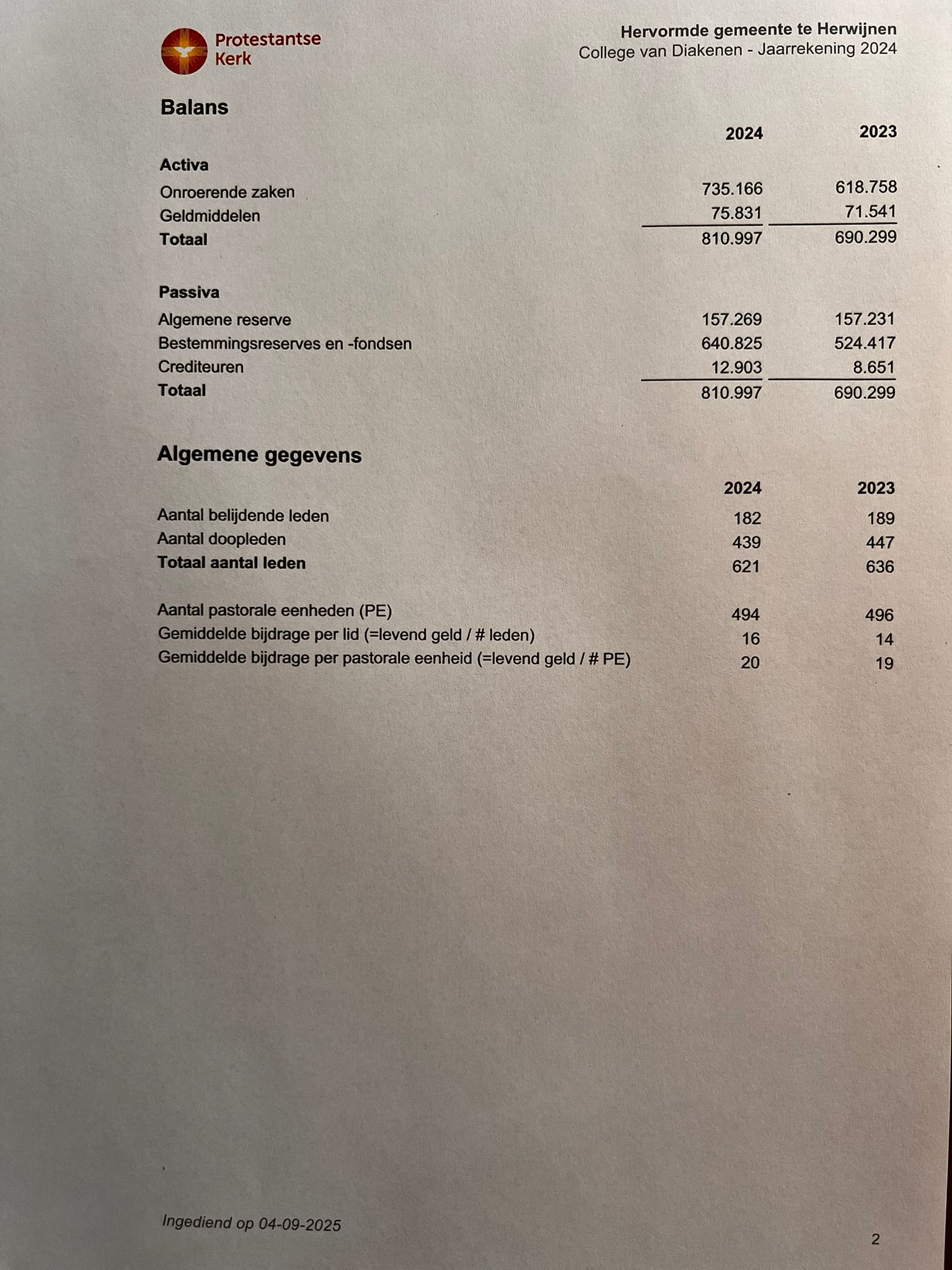 De kerkenraad heeft de algemene eindverantwoordelijkheid voor het in stand houden van een levende gemeente. Dat doen zij door zoveel mogelijk gemeenteleden in te schakelen bij het plaatselijk werk. Enkele taken zijn conform de kerkorde gedelegeerd naar afzonderlijke colleges, waaronder het College van Kerkrentmeesters en het College van Diakenen. Zij waken over de financiële slagkracht van de gemeente en leggen via een jaarverslag rekening en verantwoording af aan de kerkenraad. Een uittreksel van de belangrijkste gegevens treft u hieronder aan.